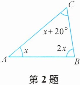 【解析】:在△ABC中,∠A=x,∠B=2x,∠C=x+20°,由三角形内角和定理得x+2x+(x+20°)=180°,解得x=40°,则∠ABC=2x=80°
