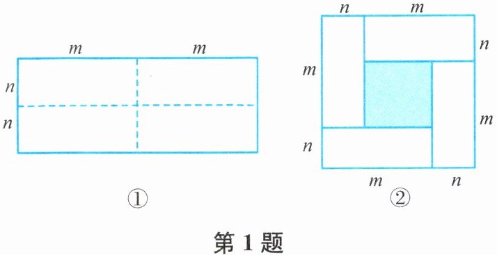 1. 图①是1个长为$ 2m $,宽为$ 2n $的长方形,沿图中虚线用剪刀平均分成4块小长方形,然后按图②的形状拼成一个正方形.