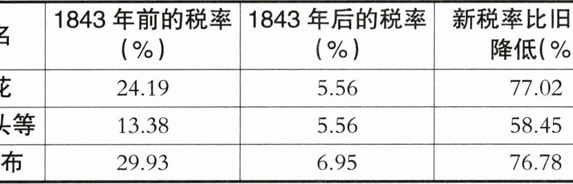 | 品名 | 1843年前的税率(%) | 1843年后的税率(%) | 新税率比旧税率降低(%) |