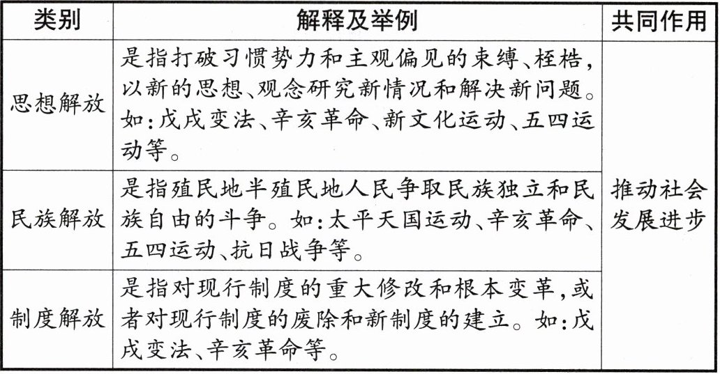 | 思想解放 | 是指打破习惯势力和主观偏见的束缚、桎梏,以新的思想、观念研究新情况和解决新问题。如:戊戌变法、辛亥革命、新文化运动、五四运动等。 | 推动社会发展进步 |