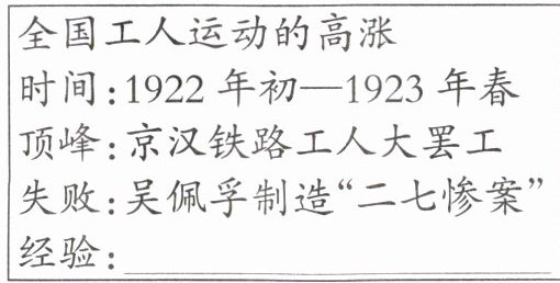 |时间:1922年初—1923年春顶峰:京汉铁路工人大罢工失败:吴佩孚制造“二七惨案”经验:______|