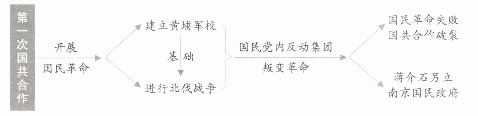 | 国共合作的实现 | 1. 1923 年,在广州举行的中共三大正式决定同____领导的国民党合作,建立____统一战线。2. 1924 年,国民党一大在____召开,标志着国共两党合作的正式建立,国民革命由此开始。3. 在苏联和中国共产党的帮助下,1924 年 5 月,孙中山创办____,为国民革命军的建立和随后的北伐战争作了准备。 | |