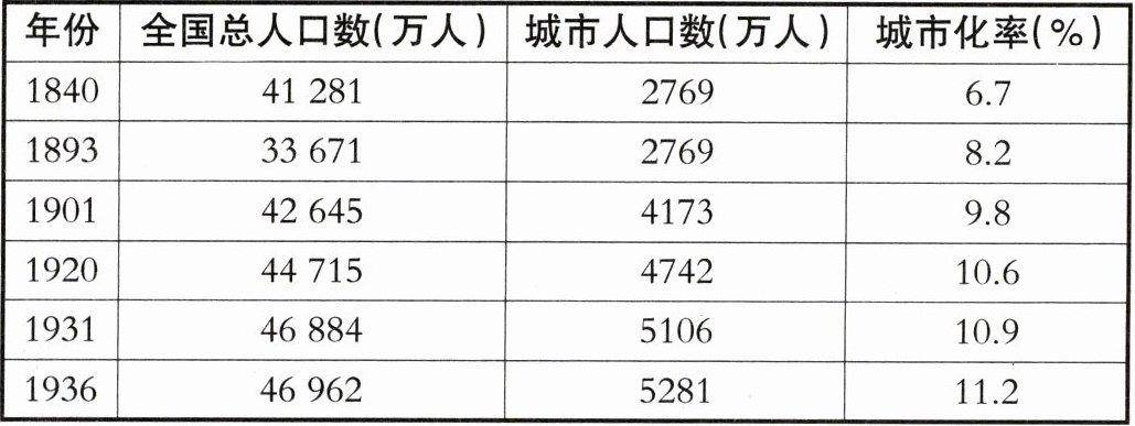 (1)根据材料一,概括近代中国城市化发展的表现。(2分)