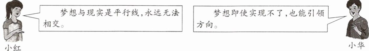 (2)①小红的观点错误。梦想与现实之间存在距离,但少年有梦,不应止于心动,更要付诸行动。努力是梦想与现实之间的桥梁,通过坚持和不懈努力,梦想是可以实现的。