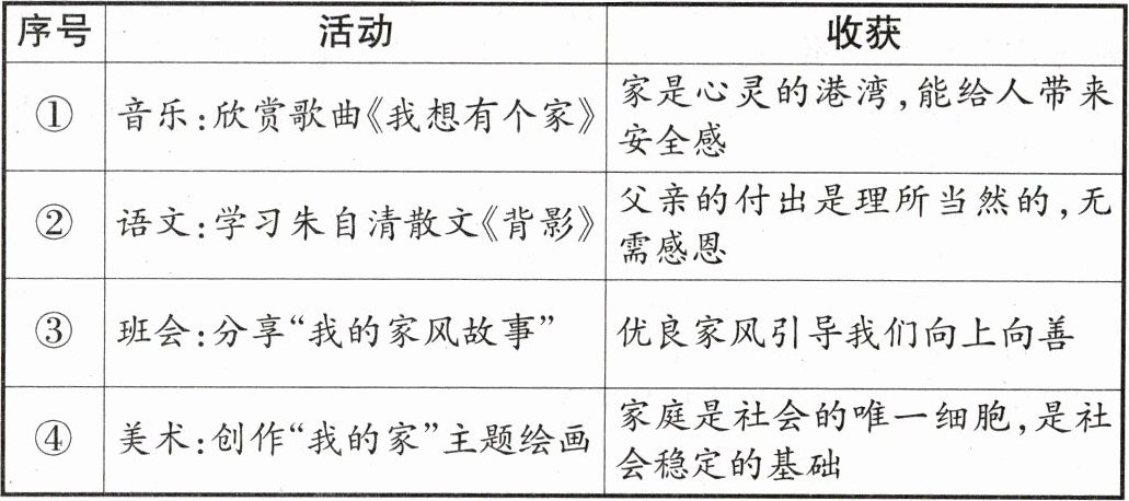 )某班开展"品味家的意味"主题学习活动。同学们在活动中的收获正确的是| 序号 | 活动 | 收获 |