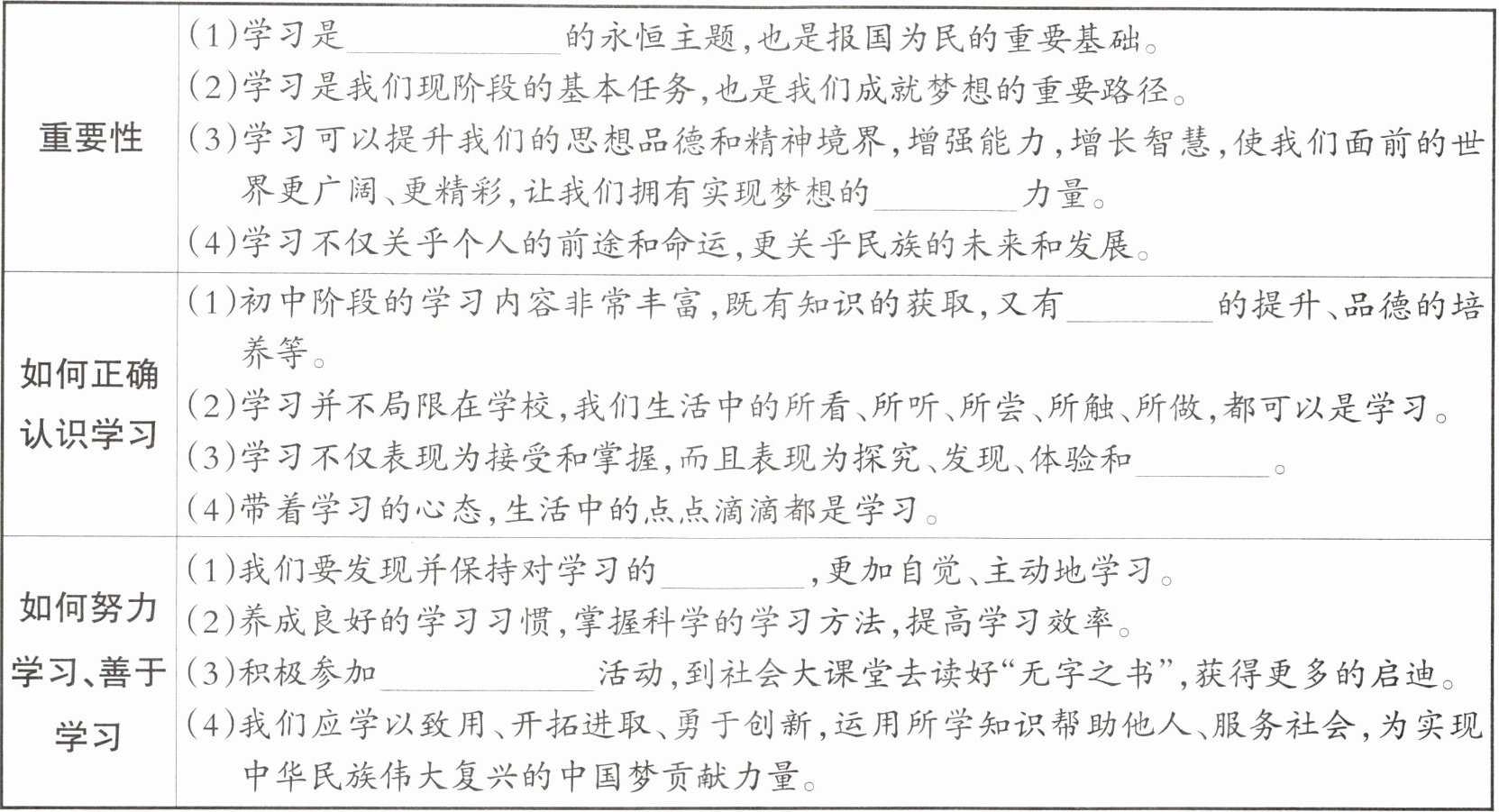 力量。(4)学习不仅关乎个人的前途和命运,更关乎民族的未来和发展。||如何正确认识学习|(1)初中阶段的学习内容非常丰富,既有知识的获取,又有