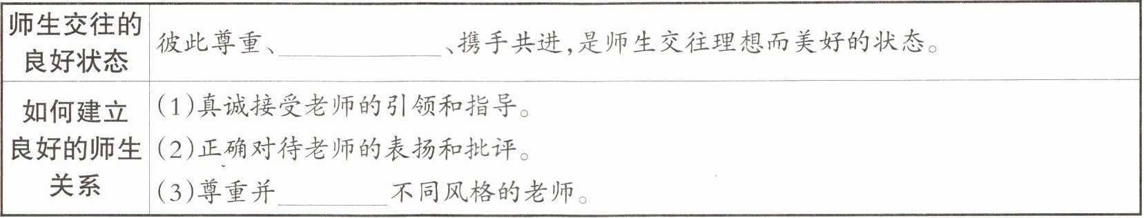 、携手共进,是师生交往理想而美好的状态。||如何建立良好的师生关系|(1)真诚接受老师的引领和指导。(2)正确对待老师的表扬和批评。(3)尊重并