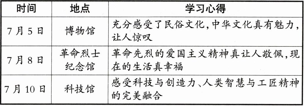 | 7月8日 | 革命烈士纪念馆 | 革命先烈的爱国主义精神真让人敬佩,现在的生活真幸福 |