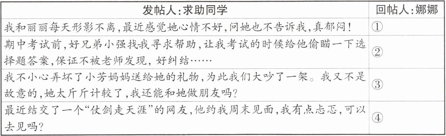 (2)阅读成长故事二,请你运用所学知识帮助娜娜回复求助帖。