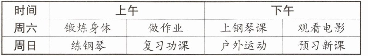 |周日|练钢琴|复习功课|户外运动|预习新课|