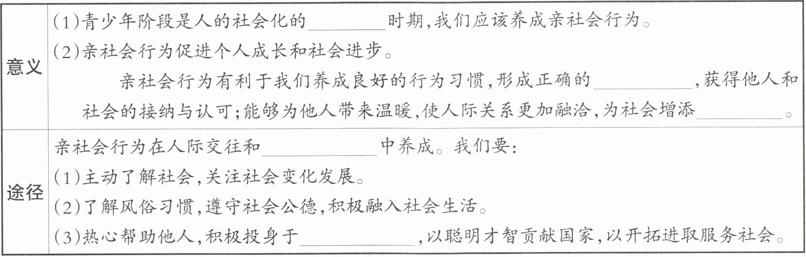 时期,我们应该养成亲社会行为。(2)亲社会行为促进个人成长和社会进步。亲社会行为有利于我们养成良好的行为习惯,形成正确的价值观