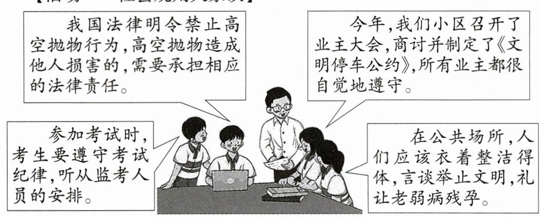 (1)①社会规则是人们为维护有序的社会环境,在逐渐达成默契与共识的基础上形成的。②社会规则包括道德、纪律、法律等多种类型,如考试纪律属于纪律,公共场所文明举止属于道德,禁止高空抛物属于法律,停车公约属于共同约定的规则。③社会规则明确社会秩序的内容,保障社会秩序的实现,是人们享有自由的保障,它划定自由边界,促进社会有序运行。