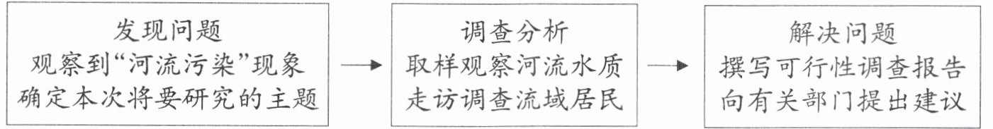 |观察到“河流污染”现象确定本次将要研究的主题|取样观察河流水质走访调查流域居民|撰写可行性调查报告向有关部门提出建议|