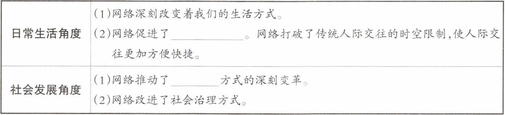 |日常生活角度|(1)网络深刻改变着我们的生活方式。(2)网络促进了