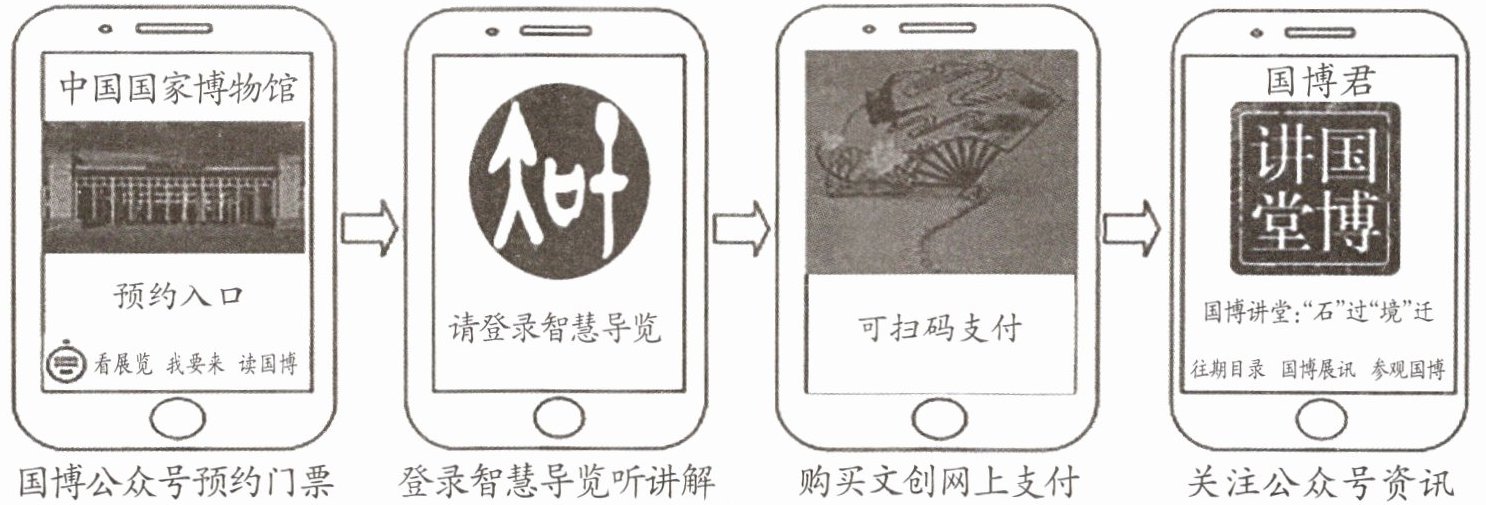 ②网络让我们的生活变得更加便利。通过国博公众号可以预约门票、扫码支付购买文创、登录智慧导览听讲解等,提高了参观的效率和体验,丰富了人们的生活。