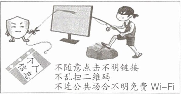 【方法点拨】本题考查合理使用网络。不随意点击不明链接、不乱扫二维码、不连公共场合不明免费 Wi-Fi 的目的是增强防范意识,保护个人隐私,故 A 项正确。材料中并未体现“信息节食”,故 B 项错误。C 项主体不符,这不是青少年要去做的事情。D 项错误,网络有利有弊,青少年要合理使用网络而不是拒绝使用网络。本题选 A。