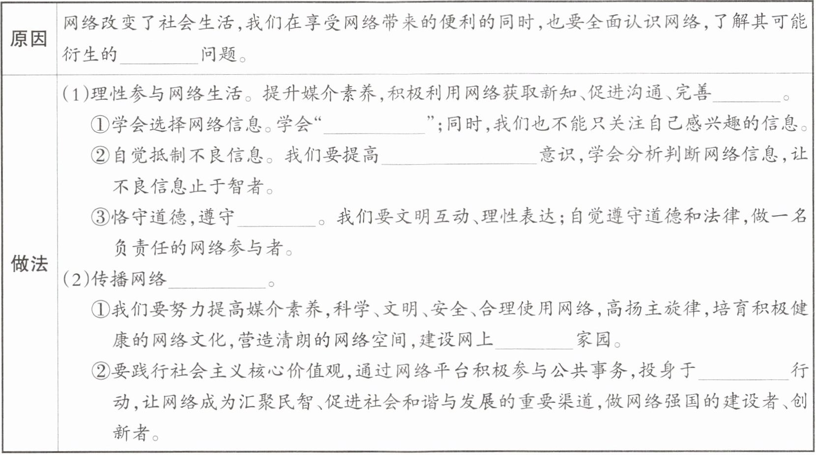 问题。||做法|(1)理性参与网络生活。提升媒介素养,积极利用网络获取新知、促进沟通、完善
