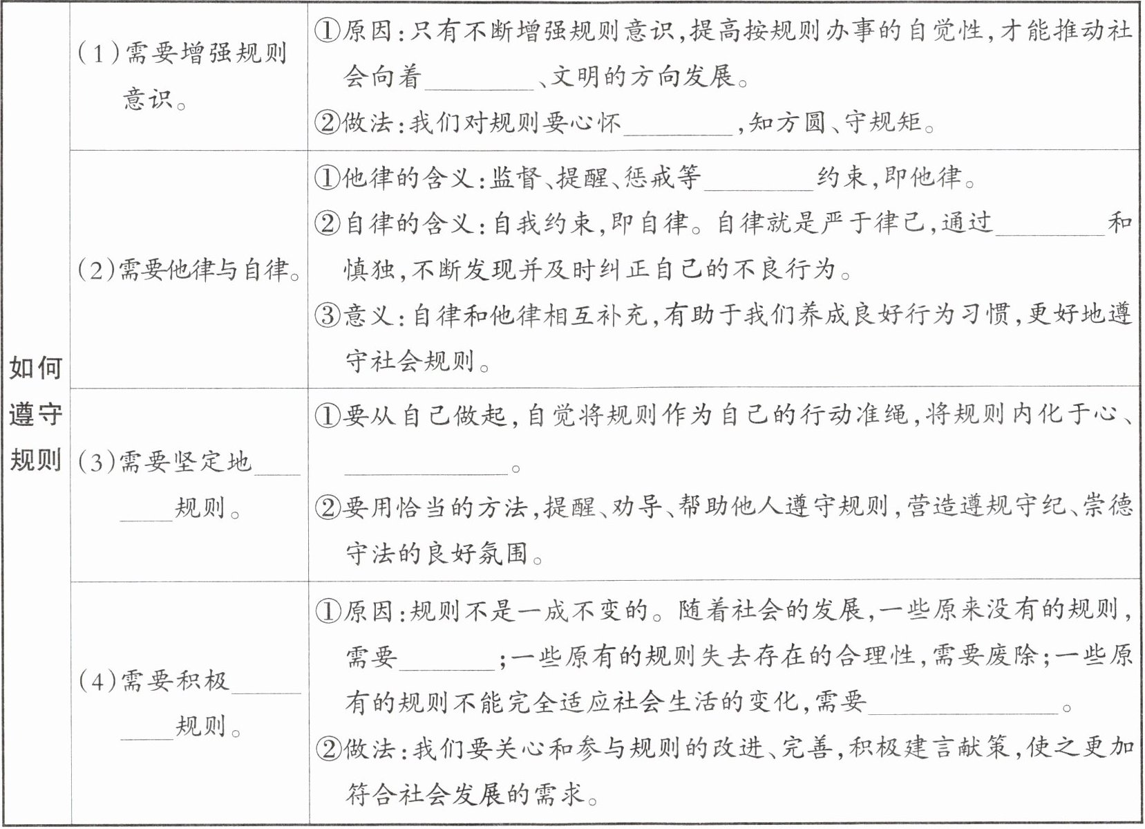 |如何遵守规则|(1)需要增强规则意识。|①原因:只有不断增强规则意识,提高按规则办事的自觉性,才能推动社会向着