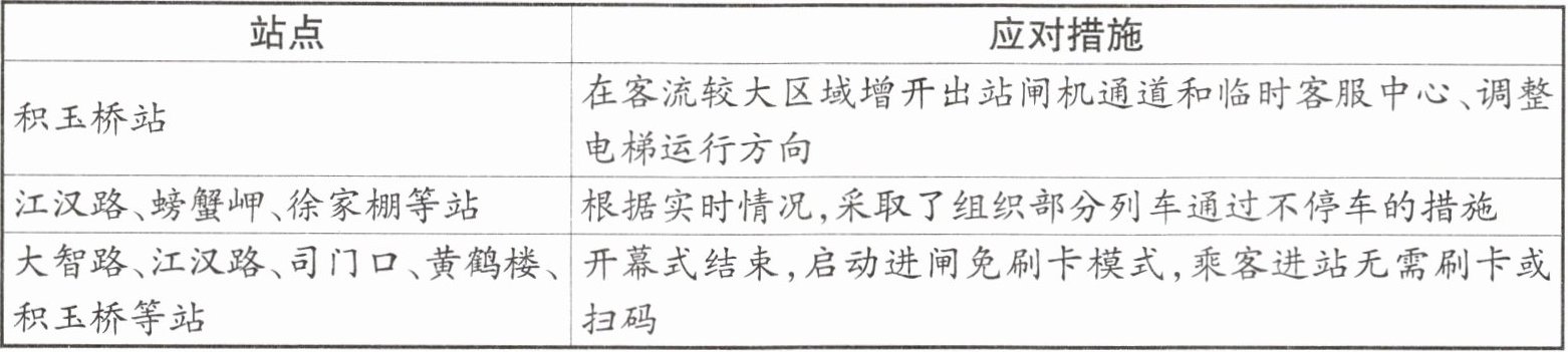 3. 为迎接首届长江文化艺术季的盛大开幕,武汉地铁提前制定专项保障方案,守护平安出行环境。部分站点应对措施如下: