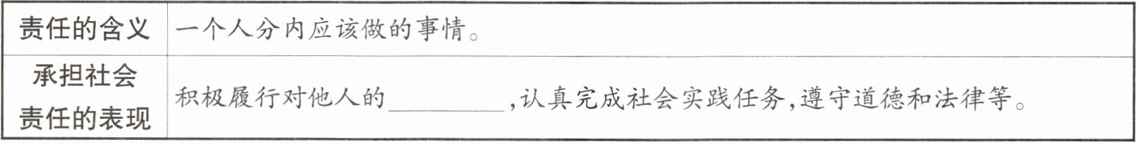 ,更好地承担起对他人、社会和国家的责任。(2)(对他人负责)只有人人具有责任心,努力做到“我为人人、人人为我”,才能增进友谊和团结,共享更加幸福美好的社会生活。(3)(对国家和社会负责)国家发展、社会进步离不开每个人的担当和奉献。|4. 承担责任的代价与回报