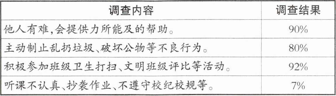 (2)调查结果说明:绝大多数学生具有责任意识,能主动关心他人、维护集体利益、遵守校纪校规;少数学生存在不负责任的行为,需进一步增强责任观念。看法:此观点错误。①责任是相互的,我们既要对自己负责,也要对他人、集体和社会负责。②个人是社会的有机组成部分,对自己负责的同时,也承担着对他人和社会的责任。③只有人人自觉承担责任,才能共建和谐集体和美好社会。