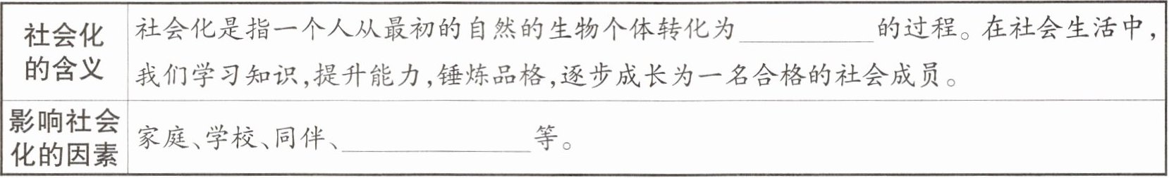 的过程。在社会生活中,我们学习知识,提升能力,锤炼品格,逐步成长为一名合格的社会成员。||影响社会化的因素|家庭、学校、同伴、