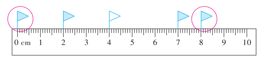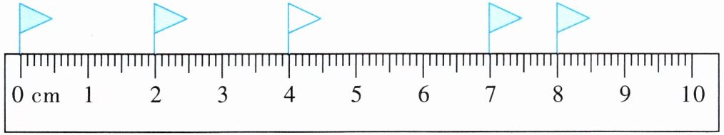 (2) 直尺上从刻度0到刻度1表示长()厘米,从刻度0到刻度10表示长()厘米,从刻度3到刻度7表示长()厘米,
