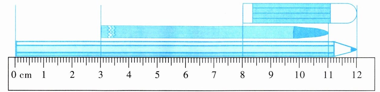 橡皮长()厘米,蜡笔长()厘米,铅笔长()厘米。