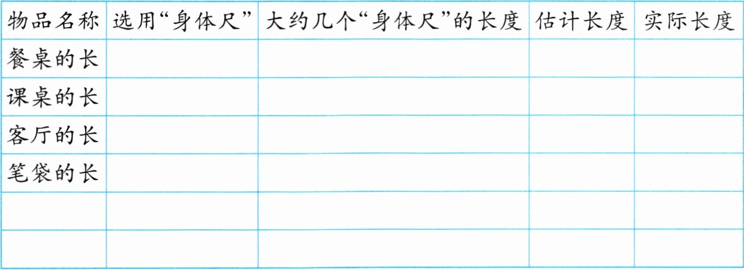 |物品名称|选用“身体尺”|大约几个“身体尺”的长度|估计长度|实际长度|
