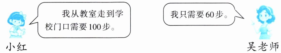 因为小红和吴老师每步的长度不同,吴老师每步的长度更长,所以从教室走到学校门口吴老师只需要60步,而小红需要100步。