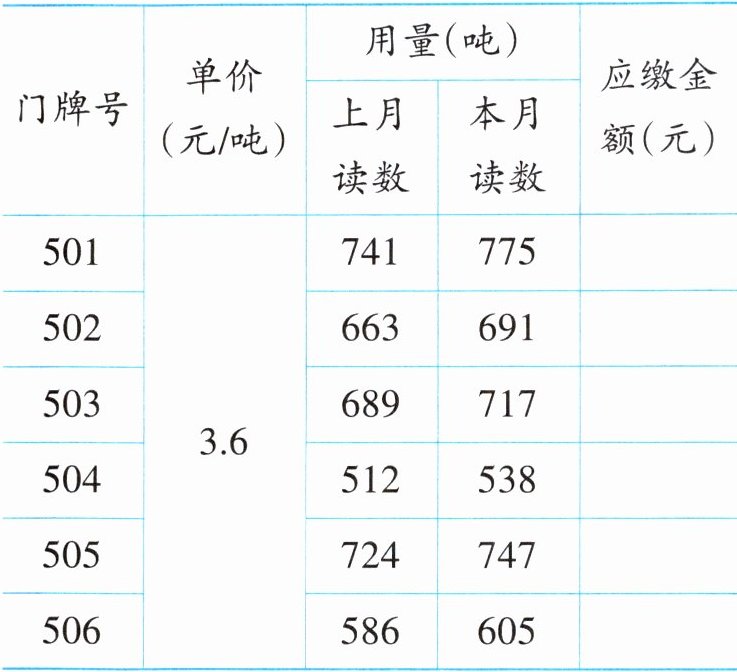 3. 下面是某层楼6户住户9月份的用水情况,算出每户应缴的水费,把它填在相应的表格中。