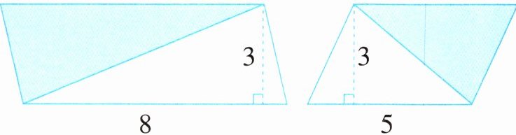 图一:$S_{平}$:$8 × 3 = 24 (dm^{2})$$S_{三}$:$8 × 3 ÷ 2 = 12 (dm^{2})$图二:$S_{平}$:$5 × 3 = 15 (dm^{2})$$S_{三}$:$5 × 3 ÷ 2 = 7.5 (dm^{2})$