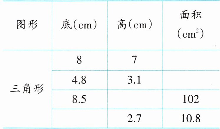 4.填表。图形 底(cm) 高(cm) 面积$(cm^{2})$三角形 8 7 284.8 3.1 7.448.5 24 1028 2.7 10.8