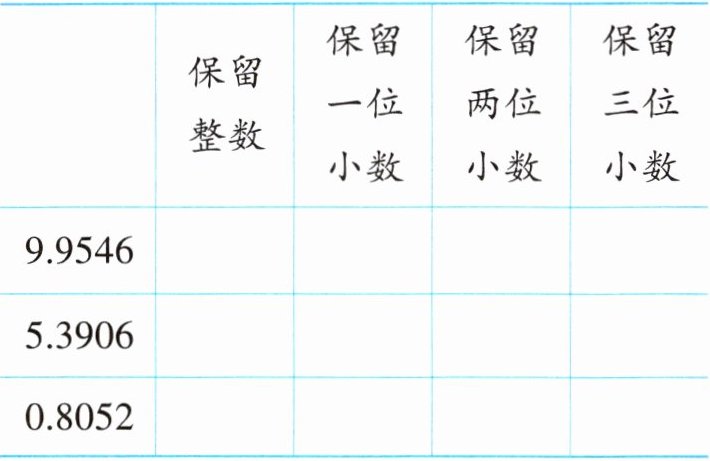 | | 保留整数 | 保留一位小数 | 保留两位小数 | 保留三位小数 |