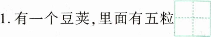 1. 有一个豆荚,里面有五粒$\begin{array}{|c|c|}\hline & wān \\ \hline & \\ \hline\end{array}\\ \hline & \\ \hline $$\begin{array}{|c|c|}\hline dòu & \\ \hline & \\ \hline\end{array}\\ \hline & \\ \hline $。它们$\begin{array}{|c|c|c|}\hline àn & zhào & \\ \hline & & \\ \hline\end{array}\\ \hline & & \\ \hline $在家庭里的地位,坐成一排。