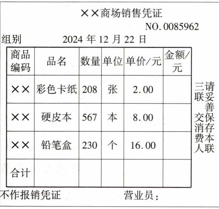 1. 下面是一张某学校购买文具的收据,请将这张收据补充完整。先笔算,再用计算器验算一下。
