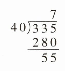 $\begin{array}{r} 7 \\ 40\enclose{longdiv}{335} \\ 280 \\ \hline 55 \end{array} $ 改正: