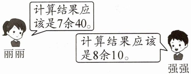 理由:在有余数的除法中,余数必须比除数小。30×7=210,250-210=40,40>30,所以丽丽的计算错误;30×8=240,250-240=10,10<30,所以250÷30=8余10,强强说得对。