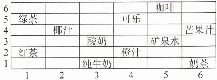 3. 五(1)班班长准备给班里的同学买红茶、橙汁、椰汁、奶茶、矿泉水,请你用数对表示它们的位置。
