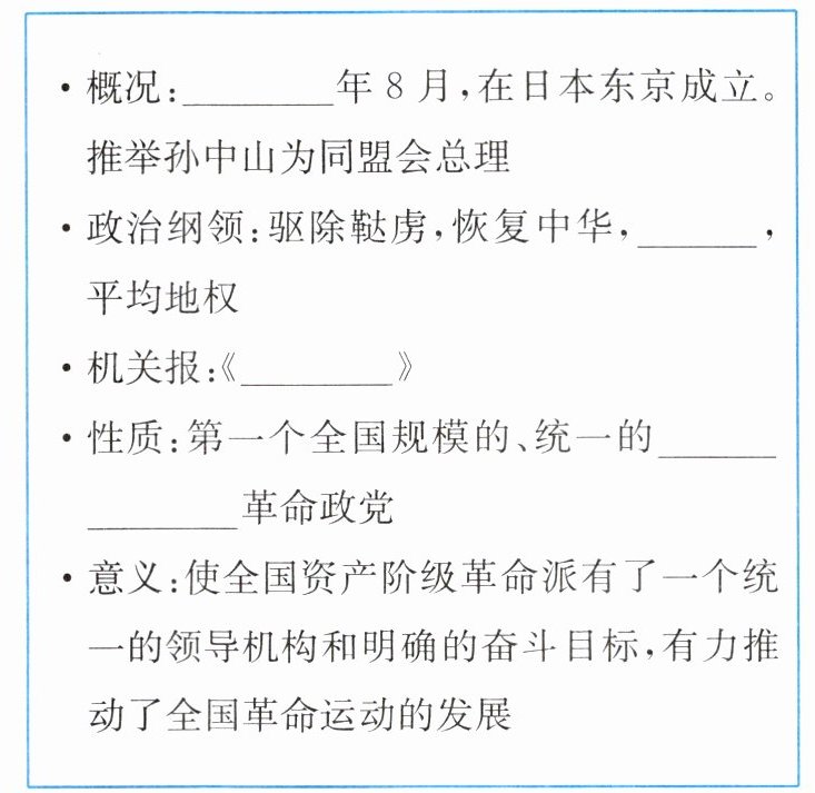 (1)内容:孙中山将同盟会的政治纲领阐发为“民族主义”“民权主义”“民生主义”,后称“三民主义”。