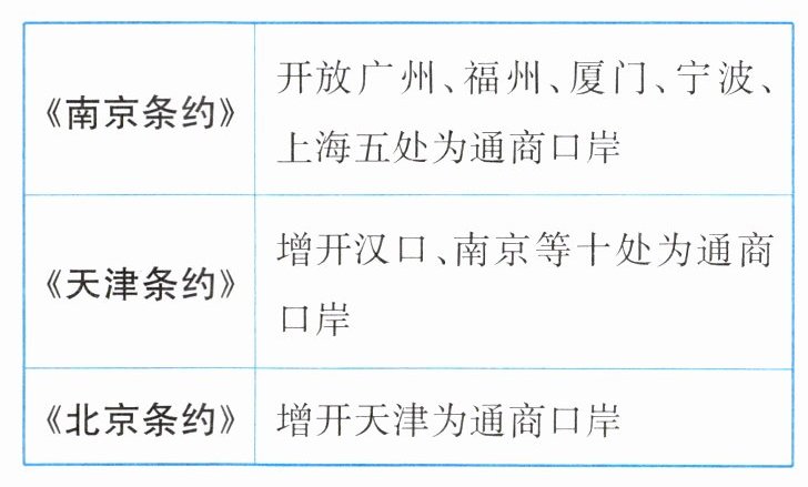 A 解析:表格中《南京条约》《天津条约》《北京条约》的重要内容均为增开通商口岸,这体现了西方列强希望打破中国的闭关状态,扩大对华商品输出和原料掠夺,本质是为了打开中国市场,谋求在华利益。