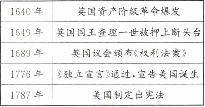 (2)英国颁布了《权利法案》;美国颁布1787年宪法。英国确立了君主立宪制;美国实行联邦制共和政体。