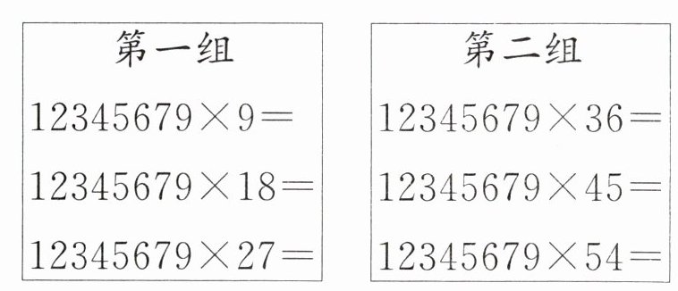 1.12345679 第二个因数分别是9的不同倍数 2.111111111 222222222 333333333 3.9 111111111 4.444444444 555555555 666666666