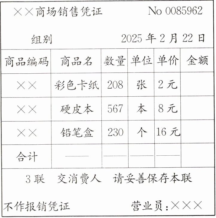 3. 下图是学校购买文具的一张收据,请算出相应的金额。先笔算,再用计算器验算。