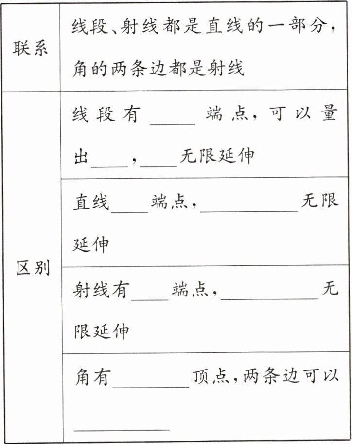 1. 两个 长度 不可以 没有 可以向两端 一个 可以向一端 一个 无限延伸 2.