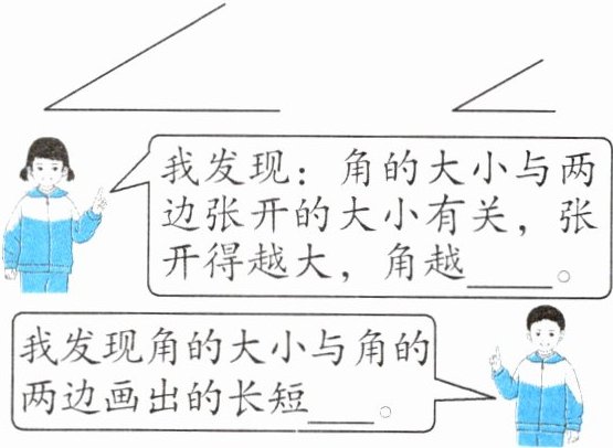 。3. 比一比:上面两个角哪个大?结合下面的一组角,你有什么发现?