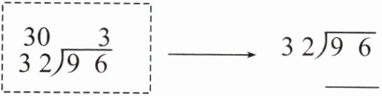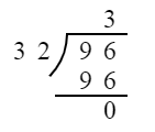 $\begin{array}{r} 3\\ 32\enclose{longdiv} {96}\\ 96\\ \hline 0\end{array} $