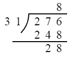 $\begin{array}{r} 8\\ 31\enclose{longdiv} {276}\\ 248\\ \hline 28\end{array} $