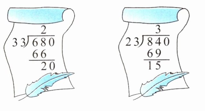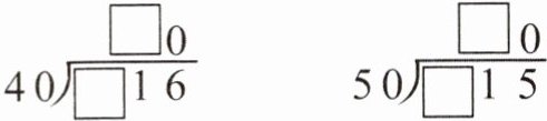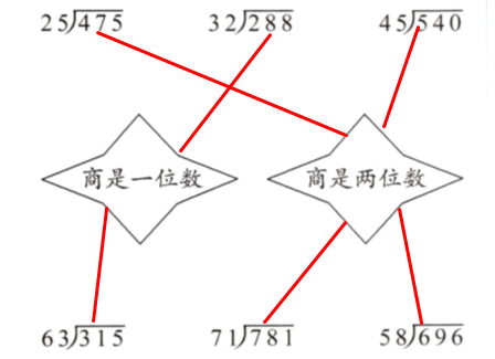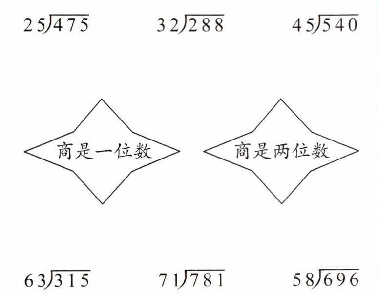 左边商是一位数:$32\enclose{longdiv}{288}$,$63\enclose{longdiv}{315}$。右边商是两位数:$25\enclose{longdiv}{475}$,$45\enclose{longdiv}{540}$,$71\enclose{longdiv}{781}$,$58\enclose{longdiv}{696}$。