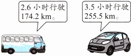 大客车速度:$174.2÷2.6 = 67$(千米/小时),公式表示为$v_1=\frac{s_1}{t_1}=\frac{174.2}{2.6}=67$(千米/小时)。
